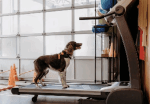 The land treadmill helps improve how your pet walks. It will force them to weight bear and balance on all four of their legs. The goal is to improve balance, coordination, and normalize how they walk. As they stride with the speed of the treadmill, their muscles flex and extend more than they would if they were walking on their own.